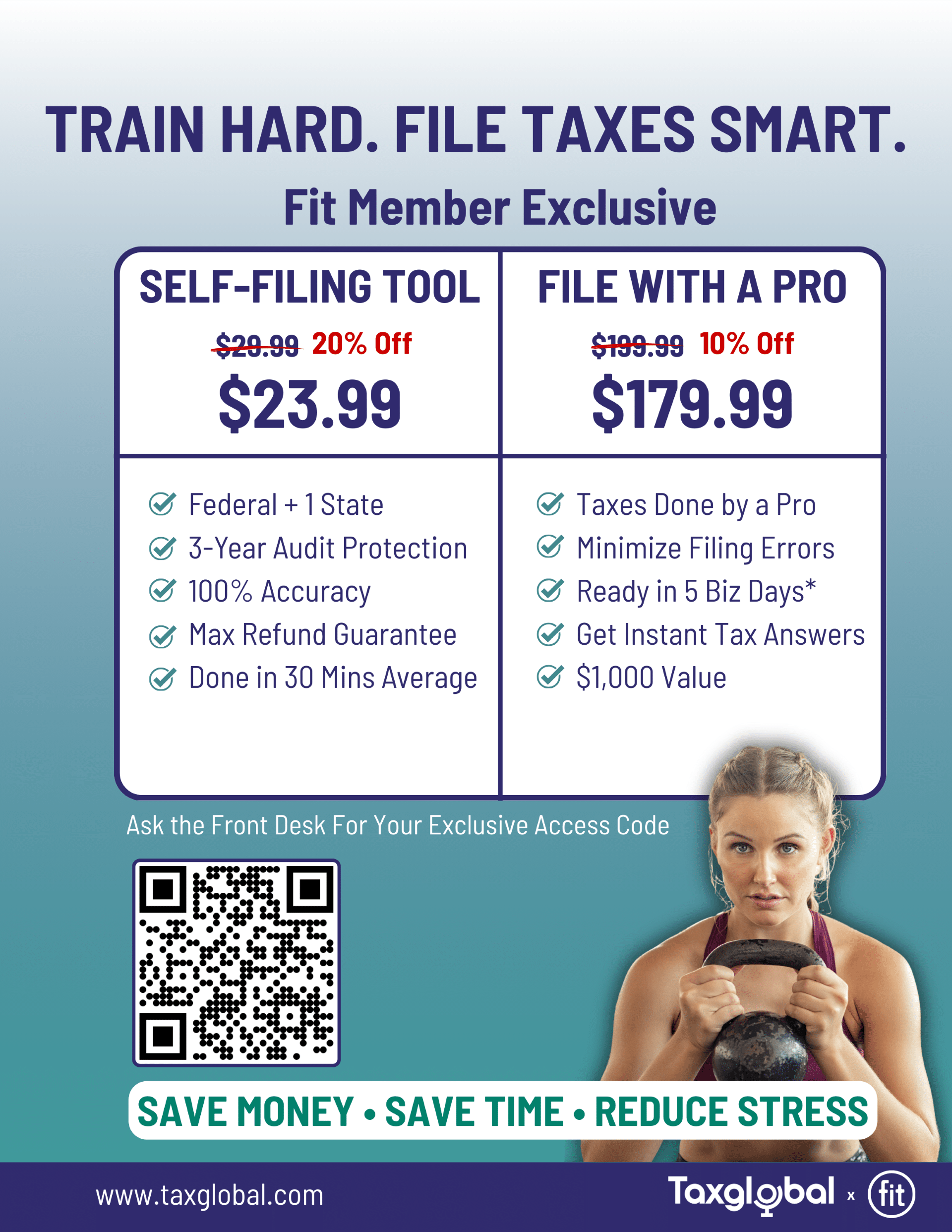 TaxGlobal.com is an AI-powered, centralized online platform that helps individuals and businesses with tax and accounting needs. It connects users to qualified tax professionals tailored to their specific situations and offers tools to streamline tax processes. We provide a self-filing solution that includes a federal return, one state return, and three years of audit protection as part of the Fit member benefit. The platform is an authorized IRS e-file provider and includes unlimited support throughout the filing process.